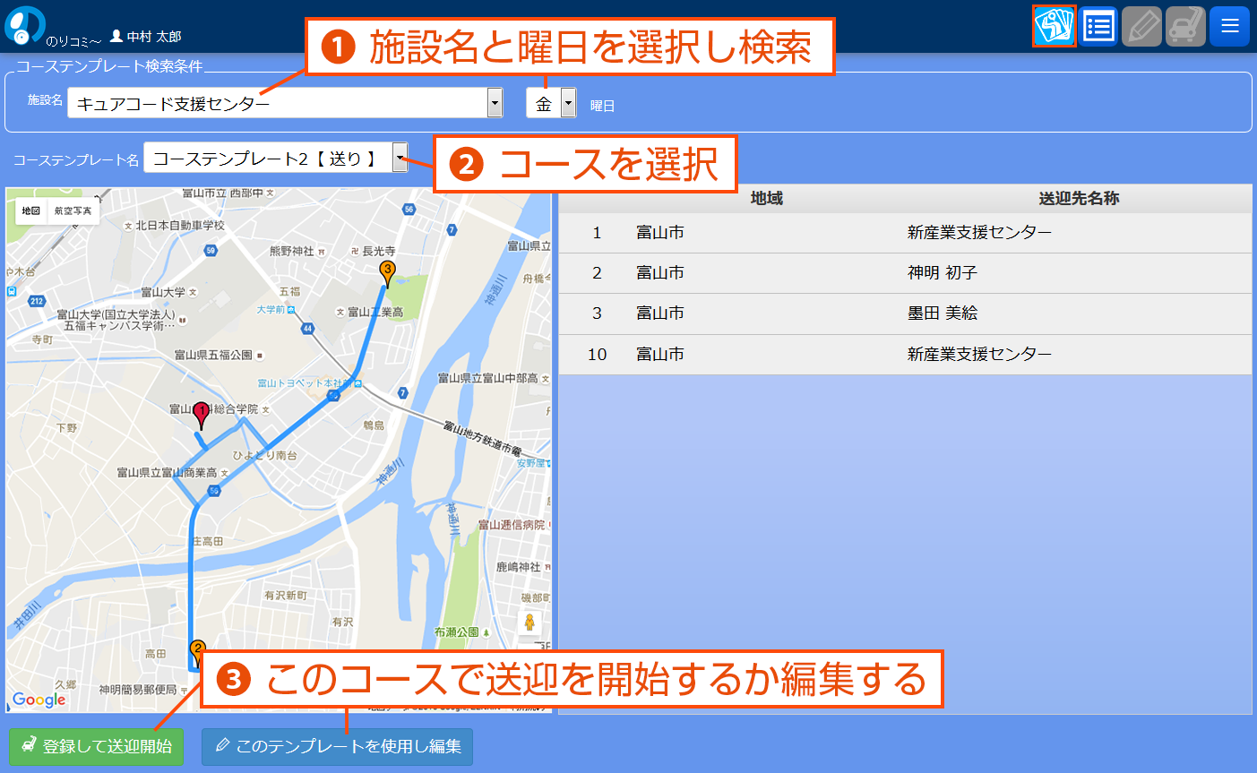 - テンプレート名は、分かりやすい名前にしてください。例:「月曜1コース」「運転手名」など